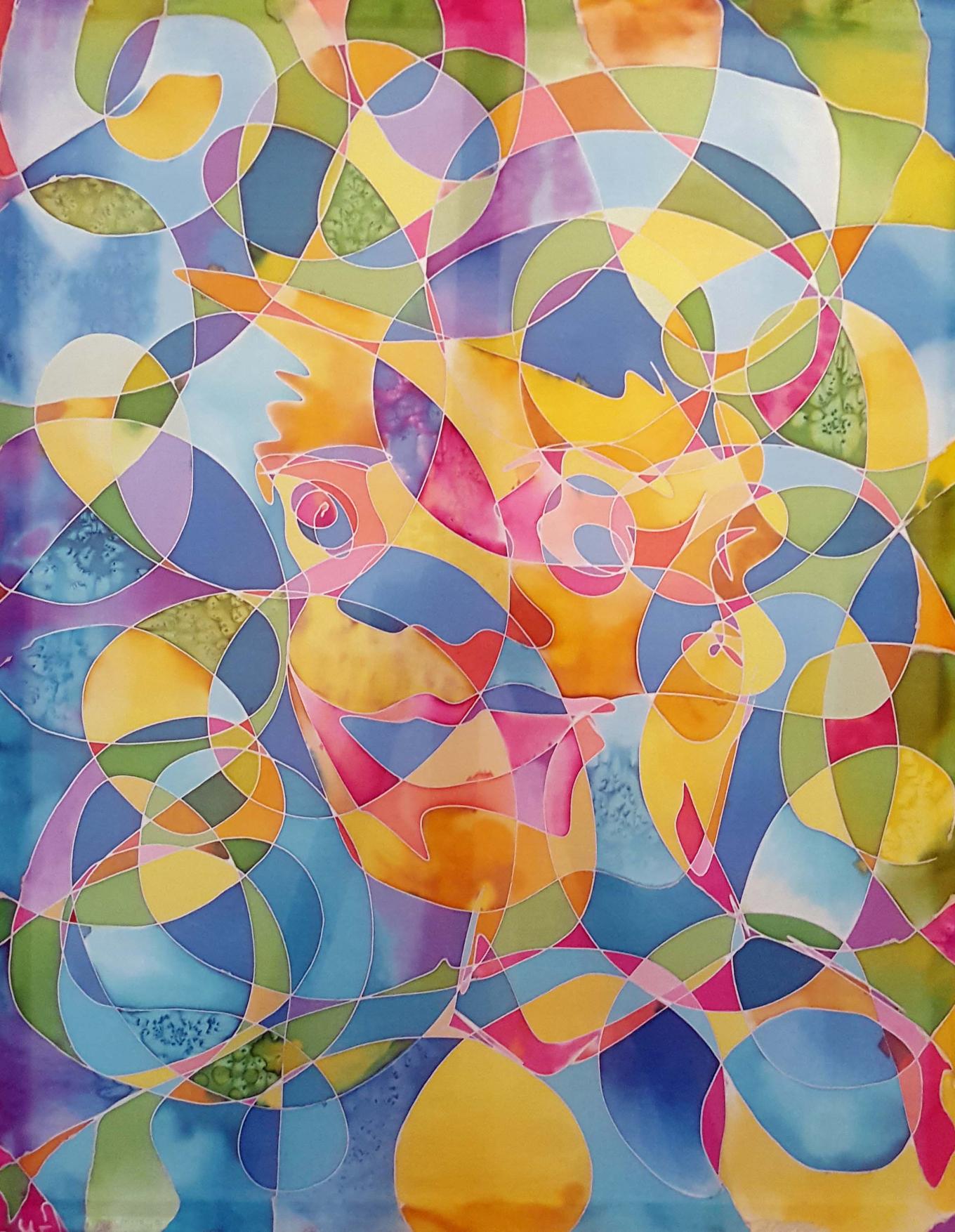 This painting is from my series of silk paintings Dormant. Each painting consists of one single line, which is quickly created on the silk. The nature of this method makes it so that you can’t go back and edit or erase lines after they have been laid out. I then go into the painting and add layers of color while reflecting on the initial movement in an attempt to find a balance. Each painting is a portrait, but instead of focusing on just the person, I blend them into their environment. Find more of Guy’s artwork on his website.