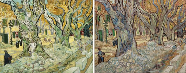 Left: Vincent van Gogh, The Road Menders, 1889. Oil on canvas, 29 x 36 1/2 in. The Phillips Collection, Washington, DC. Acquired 1949. Right: Vincent van Gogh, The Large Plane Trees (Road Menders at Saint-Rémy), 1889. Oil on fabric, 28 7/8 x 36 1/8 in. The Cleveland Museum of Art. Gift of the Hanna Fund, 1947.