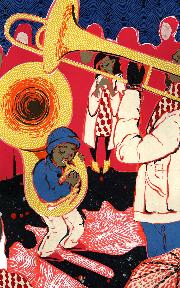 “Paying homage to the whimsy of Toulouse-Lautrec’s posters’ typography and the drama of his subjects’ clothing, this piece envisions the belle époque of today as a social media fueled era of experience-seeking over material-possessing. A musician stands onstage surrounded by a sea of flashing smartphones, posed similarly as Toulouse-Lautrec did in many of his posters—slightly off-center with movement in both the foreground and background, but with the focus always on the colorful subject.”