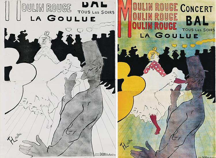 Henri de Toulouse-Lautrec (left) Moulin Rouge, La Goulue, 1891. Brush and spatter lithograph, printed in black on two sheets of wove paper. Trial proof, 65 3/4 × 46 7⁄16 in. Private collection (right) Moulin Rouge, La Goulue, 1891. Brush and spatter lithograph, printed in four colors. Key stone printed in black, color stones in yellow, red, and blue on three sheets of wove paper, 75 3⁄16 × 46 1⁄6 in. Private collection