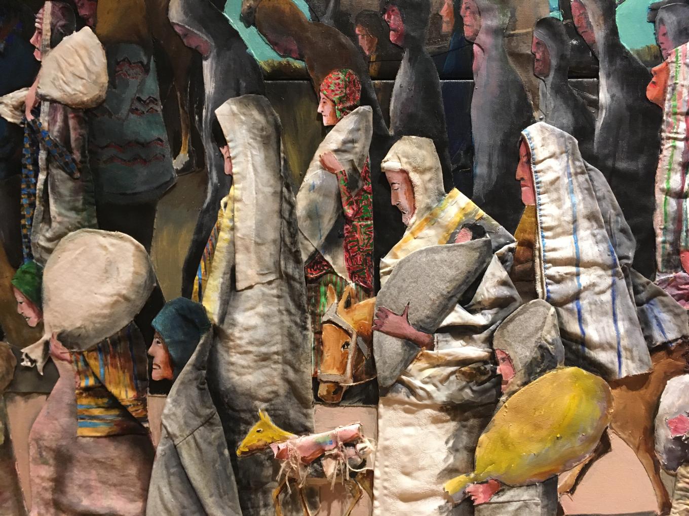 Benny Andrews (b. 1930, Plainview, Georgia, USA; d. 2006, New York City, USA), who, like Buchanan, also grew up in the south, utilized his own background as a son of sharecropping parents to approach themes of mass displacement in US history. Completed during the time Andrews was traveling to New Orleans and the gulf coast to study the areas devastated by Hurricane Katrina in 2005, Andrews’s Trail of Tears illustrates the long history of marginalization and displacement of minorities that continues to this day. His process is long and painstaking, building his scenes from layer upon layer of painted canvas and fabric, and includes, like Ward, a sort of performance. Andrews would roam his studio seeking out whatever fabric or shape called out to him and would often cut figures or images out of past canvases. This method created a remarkable blend of textures, colors, and shared experience between his work.