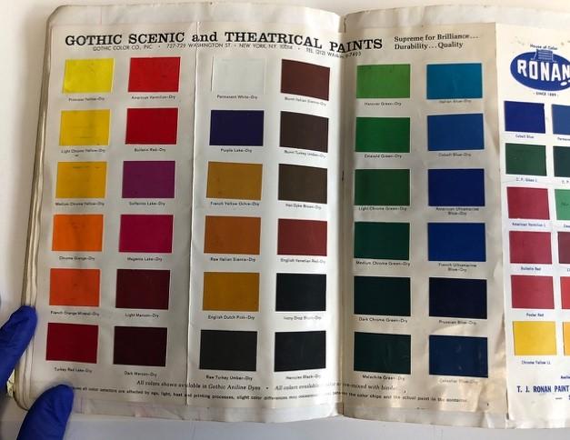 Dryer saved this color card for Gothic Scenic and Theatrical Paints in one of her notebooks. Gothic Color Company, Inc., made paints especially for theater and other scenic artists. They sold pure pigments and a variety of binders, along with a line of âCasein Fresco Colorsâ specifically developed for television studios.