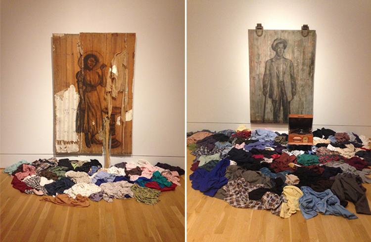 (left) Whitfield Lovell, Whispers—Mattie When you Marry, 1999. Charcoal on wood and found objects. Courtesy DC Moore Gallery © Whitfield Lovell and DC Moore Gallery, New York (right) Whitfield Lovell, Whispers—Rising River Blues, 1999. Charcoal on wood with found objects, 90 1/2 x 52 1/2 x 48 in. Courtesy DC Moore Gallery © Whitfield Lovell and DC Moore Gallery, New York