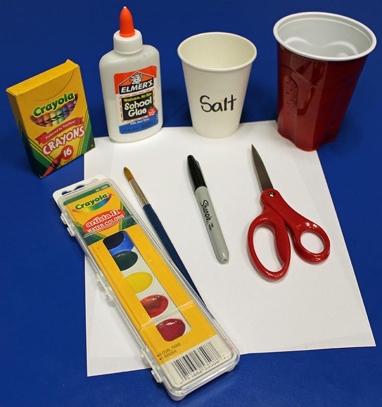 Observe/ Ask a question: The scientific method starts when you ask a question about something that you observe. Examine the watercolor paints, salt, glue, and wax crayons. For example, put a dab of glue on your fingers. Observe how it glides across your fingers. Now ask a question. Does the consistency change? What do you think the glue is made out of? Think about what questions come to mind as you examine the glue.