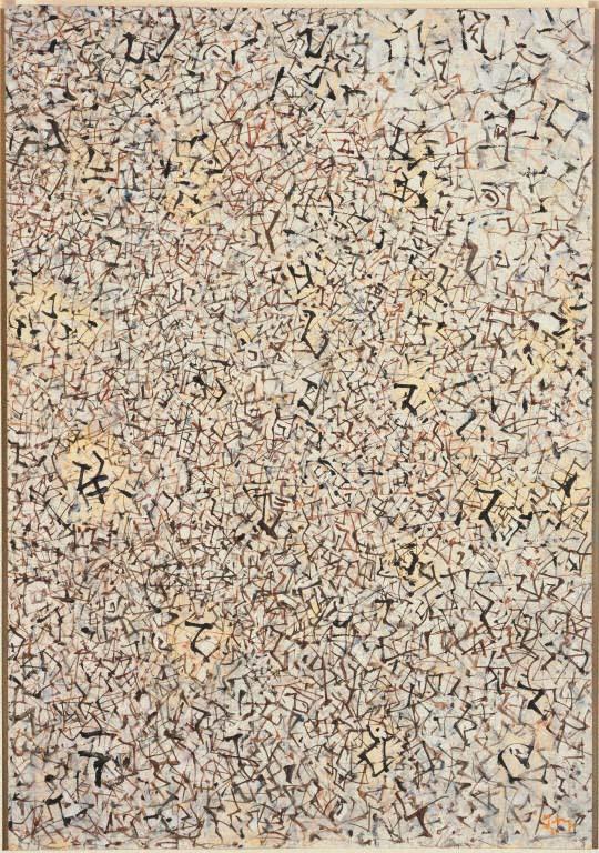 Tobey saw the potential of his calligraphic style to reconcile the rational and irrational forces of humankind and arrive at a “unified world,” one that mirrored the union of the polarizing yin-yang principles in Asian calligraphy. In this mature work, Tobey layered strokes of white, black, and beige in an all-over pattern suggestive of the unseen energies of the cosmos.