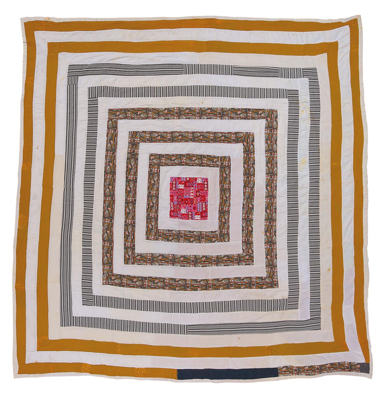 Along County Road 29, many women refer to any quilt dominated by concentric squares as a “Housetop,” which reigns as the area’s most favored “pattern.” Its all‐around simplicity hosts many experiments in formal reduction and, at the same time, offers a compositional flexibility unchallenged by other multipiece patterns. The “Housetop,” from the composite block down to its constituent pieces, echoes the right angles of the quilt’s borders, initiating visual exchanges between the work’s edges and what is inside. Traditional African American “call and response,” a ritual technique of music and religious worship, is intrinsic to the target‐like push and pull among elements. The feedback effects have mesmerized and inspired generations of Gee’s Bend quiltmakers. Conceived broadly, the “Housetop” is an attitude, an approach toward form and construction. It begins with a medallion of solid cloth, or one of an endless number of pieced motifs, to anchor the quilt. After that, “Housetops” share the technique of joining rectangular strips of cloth so that the end of a strip’s long side connects to one short side of a neighboring strip, eventually forming a kind of frame surrounding the central patch; increasingly larger frames or borders are added until a block is declared complete.