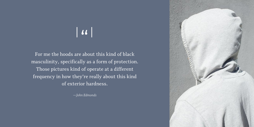 In 2019, Chief Diversity Officer Makeba Clay spoke with artist John Edmonds during a Conversations with Artists event about his Hood series, which he began as an MFA student at Yale. The series confronts the toxicity of racial bias, while exploring themes of privacy, vulnerability, and protection. Makeba Clay: So the hood is complex, it’s a complex symbol that is having us…thinking about the politicization of the Black male body, the policing of the male Black body as well, and also thinking about the softness and the beauty of the way that it is framed in your photographs. John Edmonds: For me the hoods are about this kind of Black masculinity, specifically as a form of protection. Those pictures kind of operate at a different frequency in how they’re really about this kind of exterior hardness.