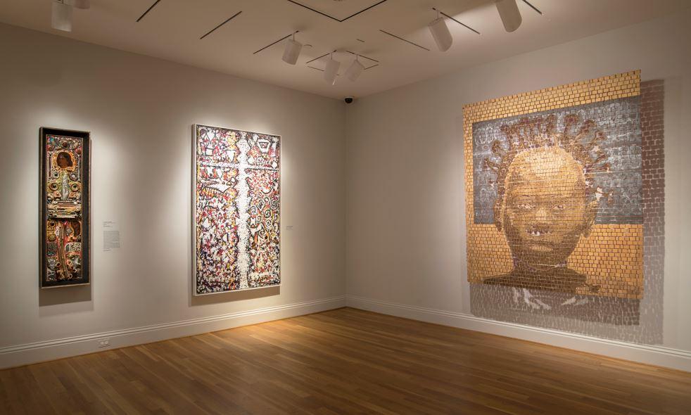 Installation view of Seeing Differently: The Phillips Collects for a New Century, featuring (left to right) Alfonso Ossorio, Excelsior (1960), Richard Pousette-Dart, Totemic Transcendental (1982), Aimé Mpane, Maman Calcule (2013), Photo: Lee Stalsworth