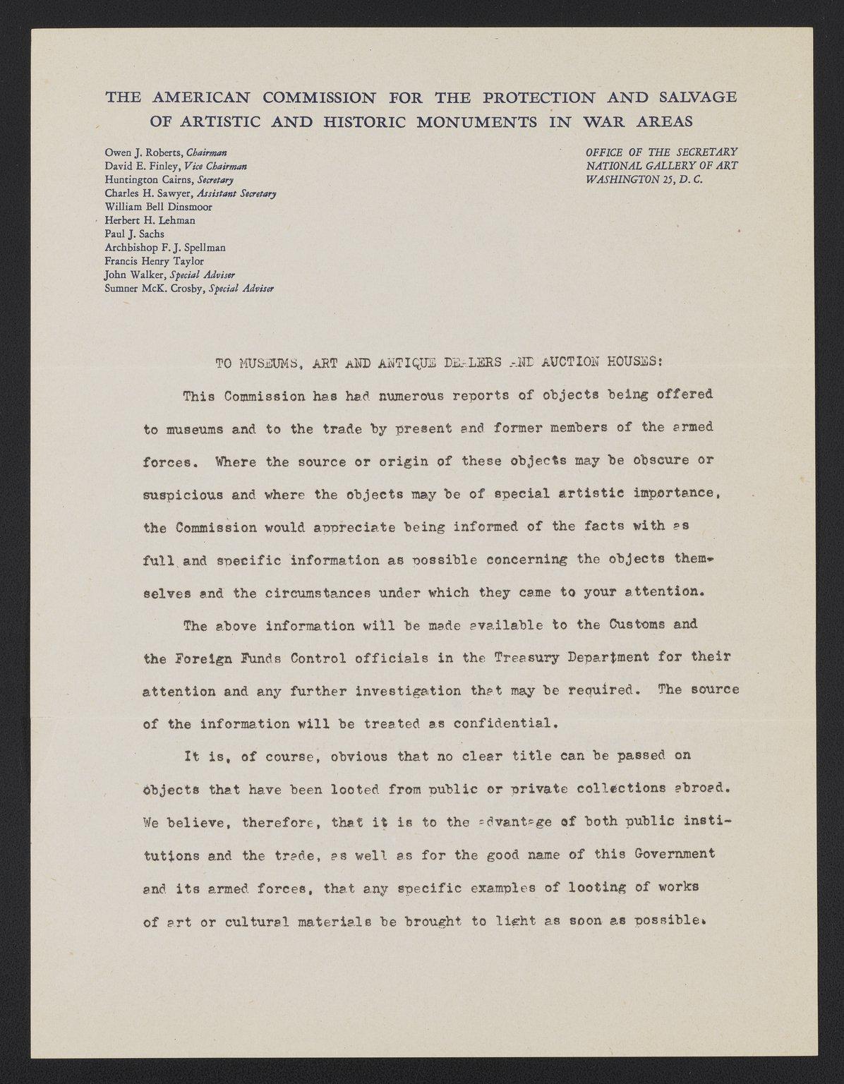 Duncan Phillips, Duncan Phillips to Major John J. Sackas, October 20, 1944, from The Phillips Collection Archives, Directorial Correspondence: The Correspondence of Duncan Phillips, https://tpcarchives.lyrasistechnology.org/repositories/2/archival_objects/2843.