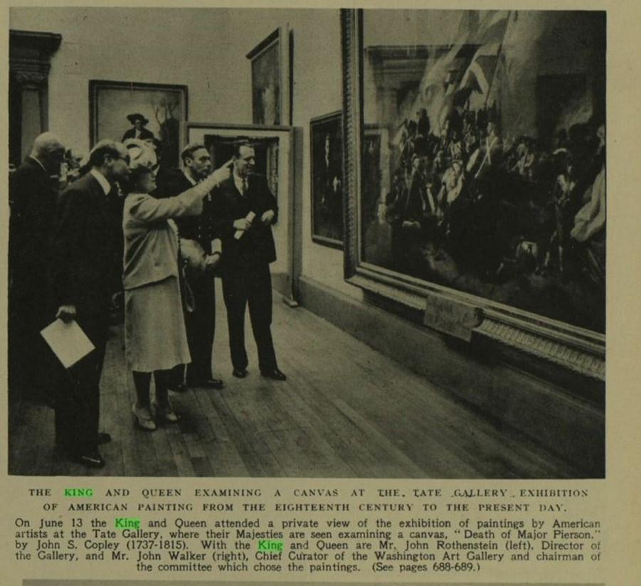In May 1945, Germany surrendered to the allies, and in September of the same year, Japan surrendered. Before the official end of the war, the Tate Gallery in London eagerly wanted to host a comprehensive American painting exhibition “as soon after the end of the war as possible.”[23] The Tate Gallery envisioned the show as a sign of gratitude toward the United States and also to commemorate the six rooms of the Tate that were damaged during the war.[24] The Tate Gallery expressed their idea to U.S. Secretary of State James Byrnes and reached out to various organizations such as the Art Advisory Committee and the Division of Cultural Cooperation.[25] All American organizations supported the proposed plan, and the Office of War Information suggested that the Tate contact the newly opened National Gallery of Art in D.C. Upon hearing about this exciting project, the director of the NGA, John Walker, invited Phillips to serve as the chairperson of the committee for selecting contemporary paintings. Other members in the committee included Alfred Barr from the Museum of Modern Art, Julian Force from the Whitney Museum, William Miliken from the Cleveland Museum of Art, and Daniel Catton Rich from the Art Institute of Chicago.[26] The members proposed 75 paintings in total and 23 of them belonged to the Phillips Memorial Gallery. Works by John Marin, Maurice Prendergast, and Thomas Eakins were especially well received by the British after the show debuted on June 14, 1946.[27] Simply put, it was not an ordinary exhibition. With strong support from the United States Department of State, it was also a diplomatic tool, and King George VI and Queen Elizabeth Bowes-Lyon even visited the show before it officially opened to the public. (Fig. 7)