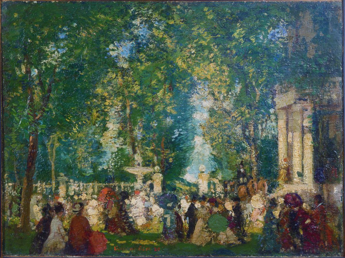 The Garden Party, its pigments applied with a palette knife, possesses a tactile quality that enlivens its surface. Its subject, however, is the romance of an American “Fête Champêtre,” a delightful dream of “old fashioned beaux and belles resplendent in costumes of the age of crinoline.”