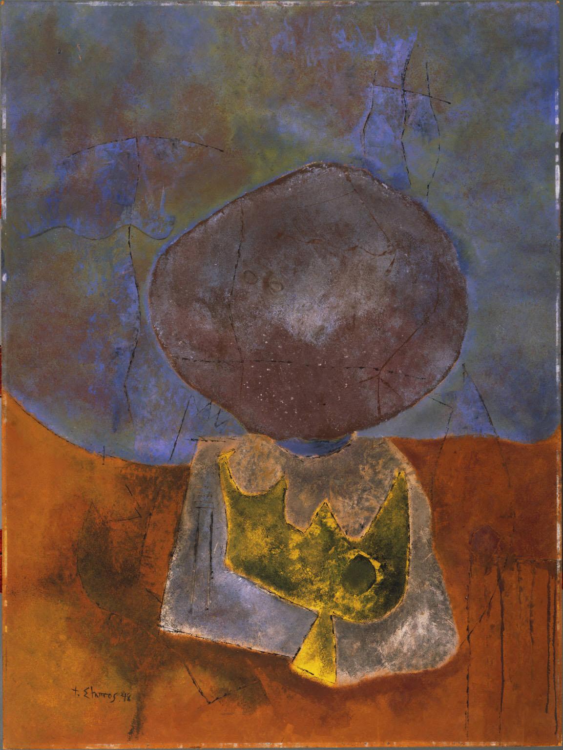 The Sacrifice of Kronos, No. 2, painted in 1948, is a prime example of Stamos’s many interests. It portrays the drama and terror of the story of the Titan Cronus (Kronos in Greek spelling), who devoured his children in fear of the prophecy that one of his offspring would usurp his power. When Cronus’s son Zeus was born, his mother, Rhea, wrapped a stone in clothing, and Cronus swallowed it, believing it was their son. The prophecy took its course, as Zeus eventually overthrew Cronus, becoming the king of the gods. Stamos has depicted the moment of the sacrifice in the painting. Two ghost-like eyes appear in the stone, alluding to Cronus’s misguided belief that it was his son he was engorging. Cronus, with gaping mouth, appears to be crushed under the weight of the massive boulder. Though this is a classic Greek mythological story, the theme of this ancient myth may well have been a metaphor for post-World War II power struggles.
