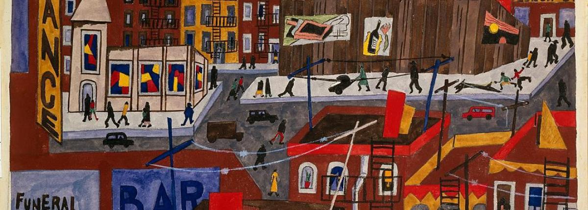 Alain LeRoy Locke was the Harlem Renaissance’s foremost philosopher and thinker. A professor at Harvard University, Locke passionately believed African-American artists should distinguish themselves by tapping into their African heritage, folk traditions, and communities as sources of inspiration. Locke’s writings and ideas reinforced Lawrence’s enthusiasm for African-American culture and the streets of Harlem as a subject matter.